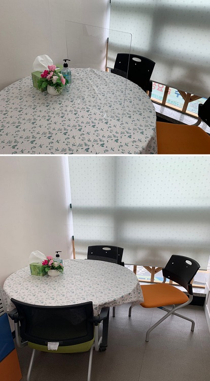 상담실에 투명아크릴도 설치하고 새롭게 단장했습니다. 이제 안전하고 아늑한 분위기에서 봬어요.(Feat.홍설희) 페이지 정보 작성자 관리자 댓글 0건 조회 2,053회 작성일 20-10-14 00:21 목록 본문 페이스북 공유 트위터 공유 구글+ 공유 이전글2020년 10월 20일 밑반찬만들기 현장사진 20.10.23 다음글2020년도 1차 운영위원회를 진행하였습니다. 20.09.18