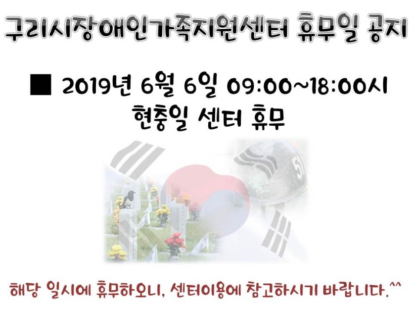 센터 휴무일 공지(6/6) 페이지 정보 작성자 관리자 댓글 0건 조회 7,013회 작성일 19-06-03 00:18 목록 본문 페이스북 공유 트위터 공유 구글+ 공유 6/7 09시에 업무 시작합니다. 이전글7월 센터일정표 19.07.01 다음글6월 센터일정표 19.06.03 댓글 0 댓글목록 등록된 댓글이 없습니다.