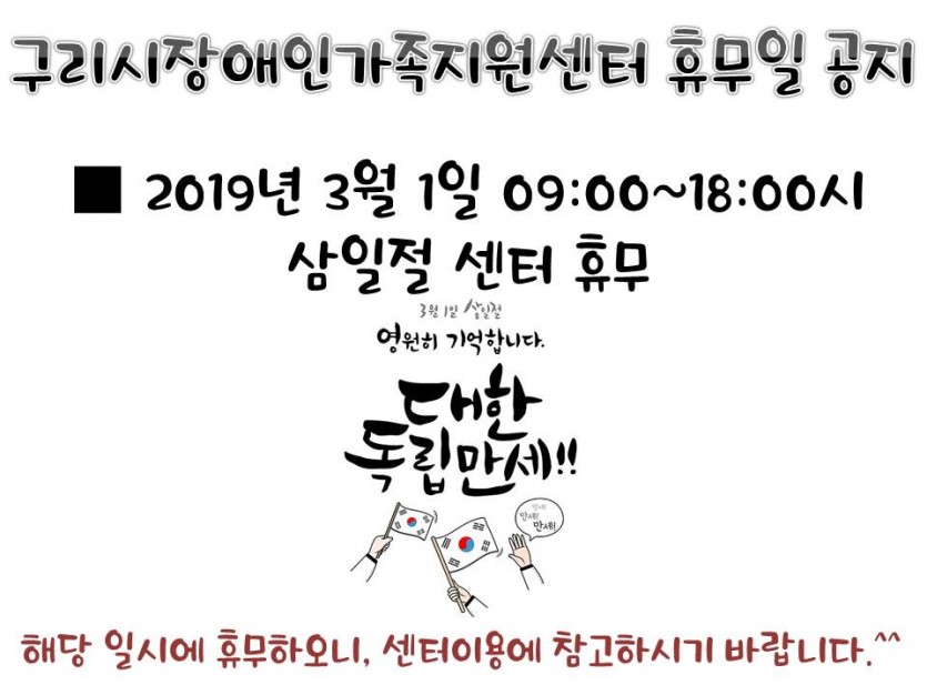 센터 휴무일 안내(3/1) 페이지 정보 작성자 관리자 댓글 0건 조회 6,893회 작성일 19-02-25 00:18 목록 본문 페이스북 공유 트위터 공유 구글+ 공유 이전글구리시장애인가족지원센터 3월 일정표 19.02.26 다음글장애인가족심리상담 참여자 모집 19.02.13 댓글 0 댓글목록 등록된 댓글이 없습니다.
