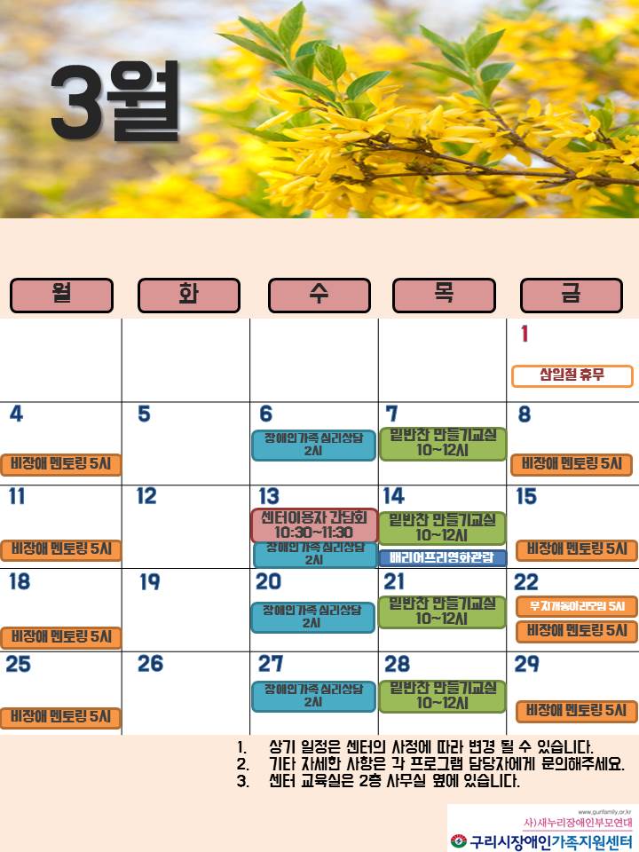 구리시장애인가족지원센터 3월 일정표 페이지 정보 작성자 관리자 댓글 0건 조회 6,673회 작성일 19-02-26 00:18 목록 본문 페이스북 공유 트위터 공유 구글+ 공유 이전글합격공고) 단기근무 동료상담사 최종 합격자 발표 19.02.27 다음글센터 휴무일 안내(3/1) 19.02.25 댓글 0 댓글목록 등록된 댓글이 없습니다.