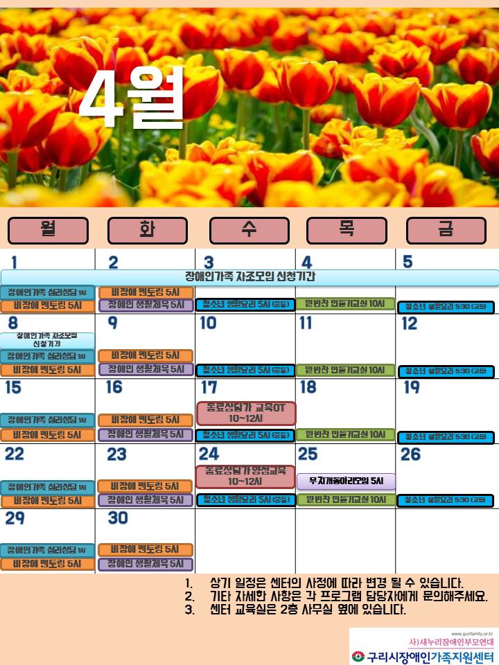 4월 센터일정표 페이지 정보 작성자 관리자 댓글 0건 조회 6,157회 작성일 19-04-02 00:18 목록 본문 페이스북 공유 트위터 공유 구글+ 공유 이전글(모집완료) 장애가족 자조모임 지원사업 참여자 모집(4/1~4/8) 19.04.09 다음글(모집완료) 장애인 생활체육 프로그램 참여자 모집 19.03.21 댓글 0 댓글목록 등록된 댓글이 없습니다.