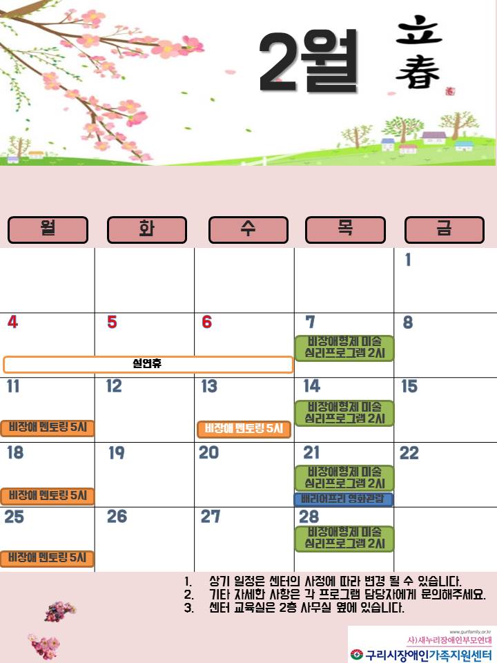 구리시장애인가족지원센터 2월 일정표 페이지 정보 작성자 관리자 댓글 0건 조회 8,037회 작성일 19-02-07 00:18 목록 본문 페이스북 공유 트위터 공유 구글+ 공유 이전글(마감) 2월 배리어프리 영화(말모이) 관람 안내 19.02.20 다음글2019년 구리시장애인가족지원센터 예산총괄표 19.02.07 댓글 0 댓글목록 등록된 댓글이 없습니다.