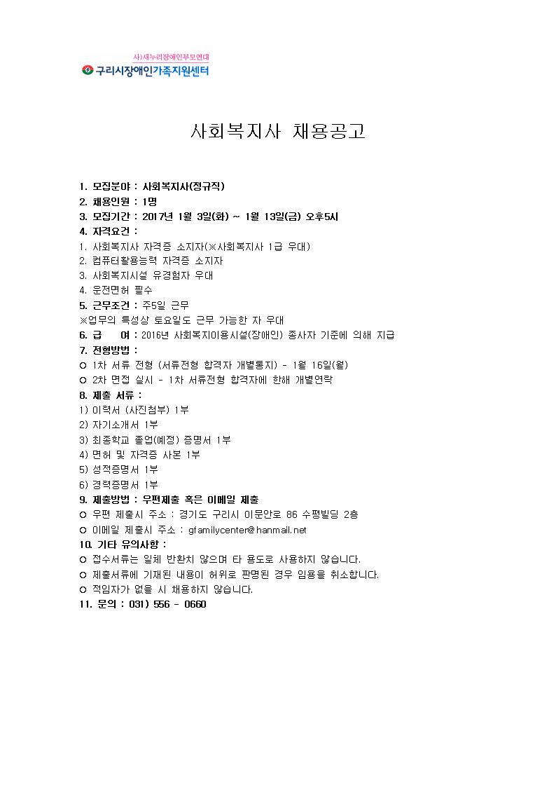 사회복지사 채용공고 페이지 정보 작성자 이윤옥 댓글 0건 조회 7,952회 작성일 17-01-03 00:18 목록 본문 페이스북 공유 트위터 공유 구글+ 공유 null 이전글센터 홈페이지 리뉴얼 중입니다. 17.05.17 다음글발달장애인 자립생활준비 체험홈 프로그램 모집안내 16.12.09 댓글 0 댓글목록 등록된 댓글이 없습니다.