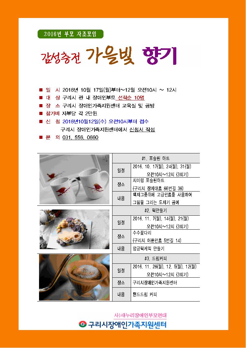 2016년 부모 자조모임 감성충전 가을빛 향기 (사진 첨부) 페이지 정보 작성자 김용기 댓글 0건 조회 7,845회 작성일 16-10-11 00:18 목록 본문 페이스북 공유 트위터 공유 구글+ 공유 이전글발달장애인 자립생활준비 체험홈 프로그램 모집안내 16.12.09 다음글발달장애부모 힐링 백일장 어머니, 나르샤 공고 16.09.28 댓글 0 댓글목록 등록된 댓글이 없습니다.