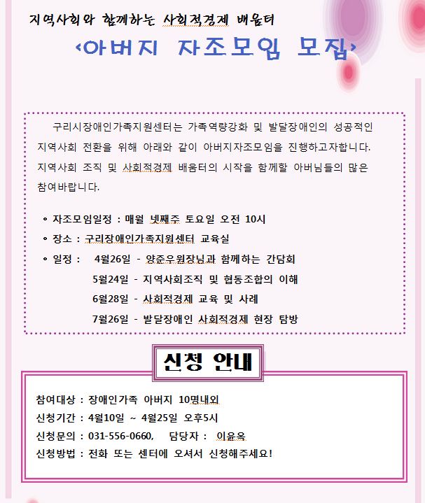지역사회 전환을 위해 아래와 같이 아버지자조모임을 진행하고자합니다.