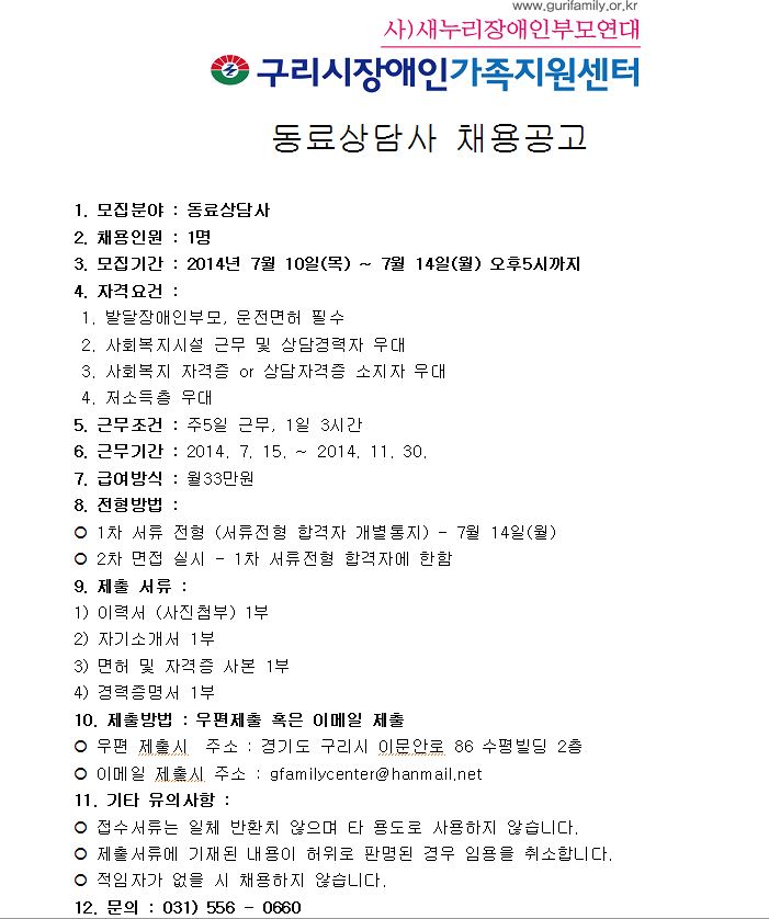 동료상담사 채용공고 페이지 정보 작성자 이윤옥 댓글 0건 조회 7,572회 작성일 14-07-10 00:18 목록 본문 페이스북 공유 트위터 공유 구글+ 공유 이전글가족수련회 모집 조기마감 안내 14.07.15 다음글가족수련회 모집 14.07.09 댓글 0 댓글목록 등록된 댓글이 없습니다.