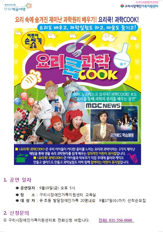 <요리쿡! 과학COOK!>은 세균맨의 유혹에 빠진 뿡이를 올커니 할아버지와 요리사, 마술사가 돕는다는 스토리입니다. 3개의 요리 만들기, 약 10여개의 과학원리, 6곡의 춤과 노래, 공기의 이동을 배우는 구름도너츠 퍼포먼스, 5가지의 마술 등이 스토리와 연관되어 진행됩니다.